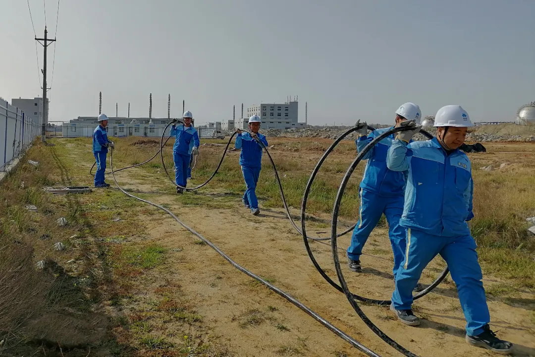 上下同欲者勝。項目部針對路途遠、供貨慢的現狀,經過價格對比協調泉州石化的電纜運到現場。沒有施工人員,黨員干部率先垂范齊上陣,肩扛手拉起比胳膊還粗的電纜自行敷設,他們在難度最大的電纜拐彎處,一邊喊著口號一邊使勁往前拽,人人臉漲的通紅,脖子上暴起青筋,空氣中回蕩著號子聲,最終在汗水與吆喝聲中敷設好了一條保障供給的“動力脈絡”。
