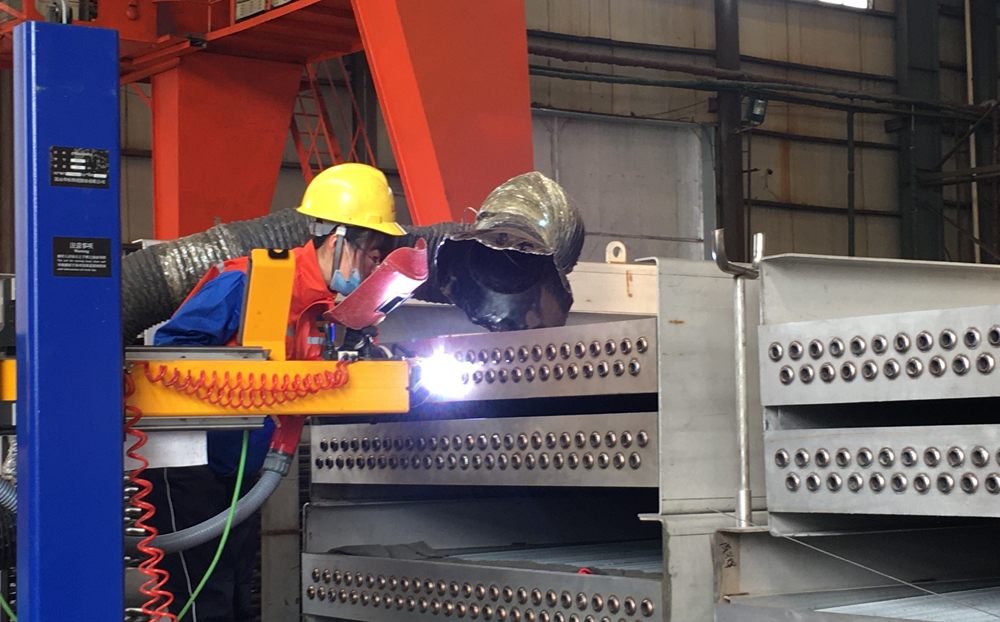 在設備制作現場,員工們正在熱火朝天的忙碌著。有的在彎制蒸發(fā)冷管束,有的在焊接蒸發(fā)冷箱體,有的在焊接蒸發(fā)冷管箱管頭……。記者現場采訪了一名焊工孟麗娟,她告訴記者:“通過實施定量定價小段包工,我原來每天焊接蒸發(fā)冷管箱230個管頭,現在焊接300個左右,工作效率明顯提高了,工資收入增長了,干勁更足了?!?